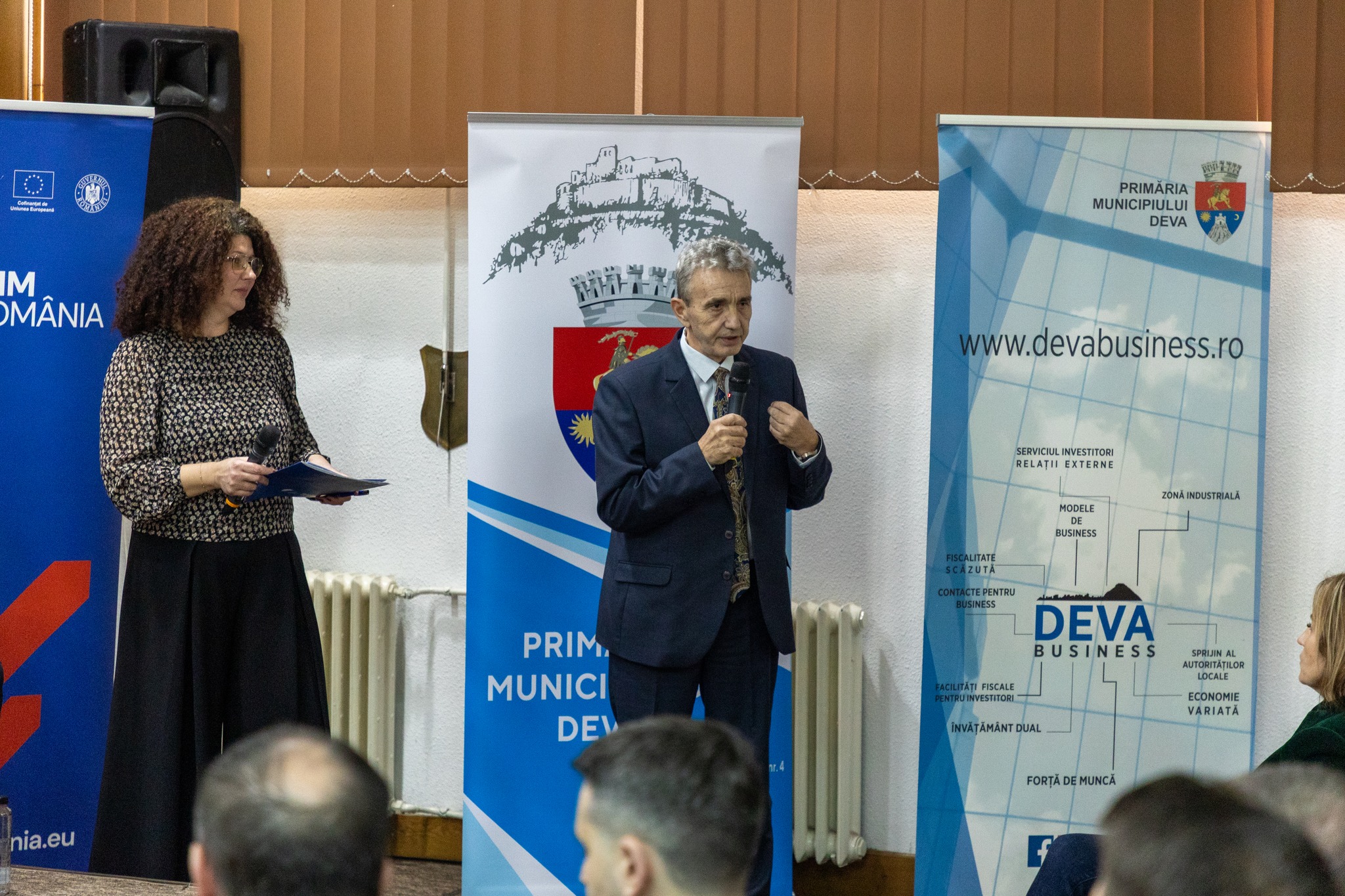 Primarul municipiului Deva, domnul Lucian Ioan Rus a prezentat măsurile de sprijin implementate de municipalitate pentru susținerea mediului de afaceri local, precum și principalele inițiative destinate atragerii de noi investitori. Au fost evidențiate rolul Consiliului Consultativ al Oamenilor de Afaceri din Deva, ca instrument esențial de dialog între administrația publică și mediul economic local, precum și schema de ajutor de minimis prin care sunt acordate facilități fiscale pentru atragerea și realizarea de noi investiții cu capital privat și pentru crearea de noi locuri de muncă în municipiu.
